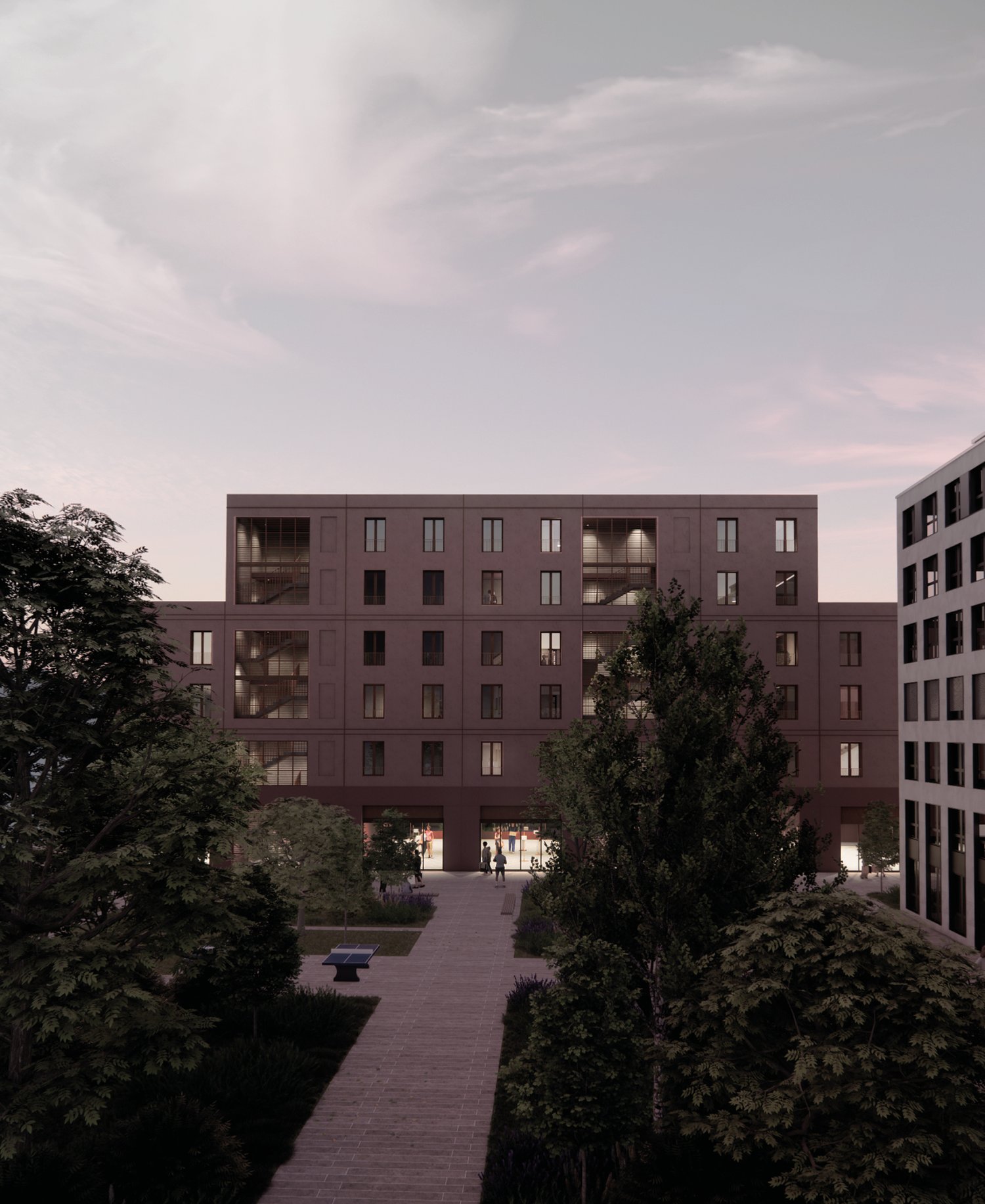 - Mode constructif hybride : socle en béton sur lequel repose une structure poteau-poutre en bois
